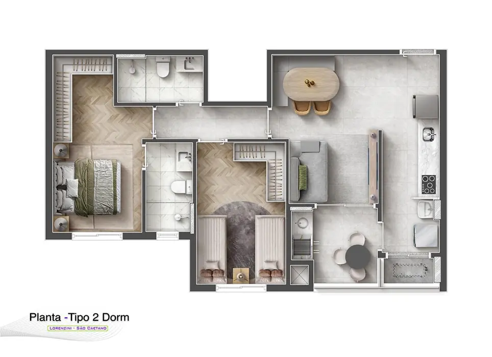 *68 m²* com 2 dormitórios (1 suíte), 1 vaga e depósito.